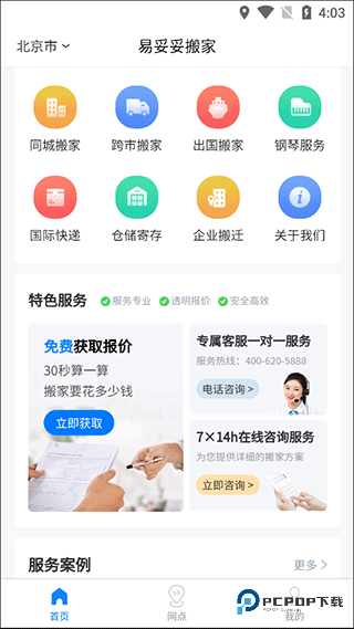1、通过本站下载易妥妥搬家app安装进入,在首页我们能看到同城搬家、跨市搬家、出国搬家等服务;