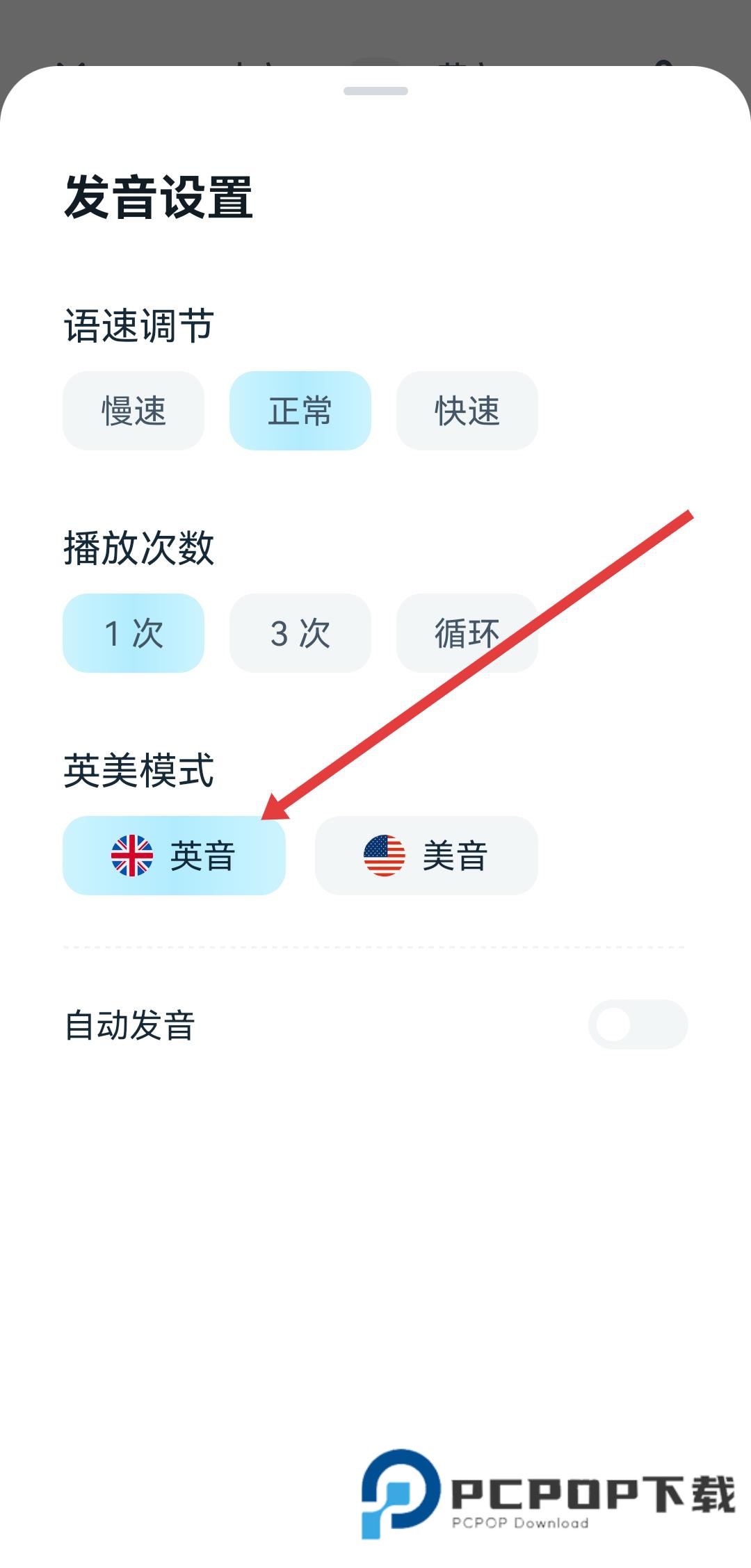 4、在发音设置页面的英美模式区域,点击美音或英音按钮,即可切换发音模式。