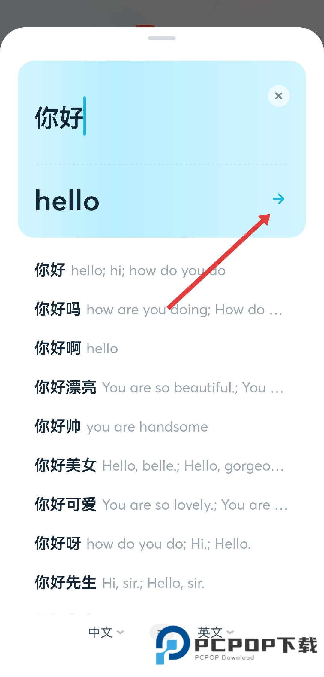 2、输入内容后,点击翻译结果区域右侧的箭头,进入详细翻译展示页面。
