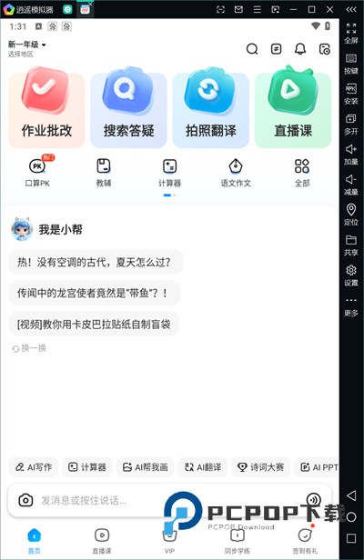 3、选择完成后进入软件首页,在首页的位置选择相应的功能进行体验,在上方有作业批改、搜索答疑、拍照翻译以及直播课等诸多实用功能;