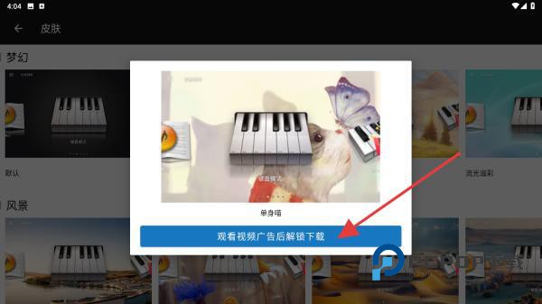 3、若皮肤需观看广告解锁,点击弹出窗口中的观看视频广告后解锁下载按钮,看完广告后皮肤会自动应用到钢琴界面。
