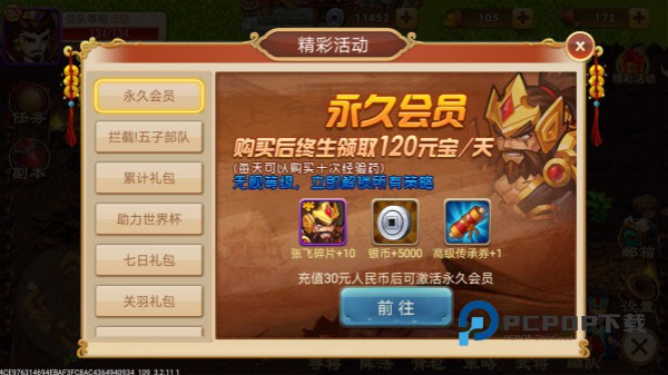 2、一开始建议大家最好30元充值永久会员,每天领取120元宝,这样后期可以做很多事,因为后期好多装备以及英雄碎片都是需要元宝购买的。充值之后,切记在7天之内领取的元宝以及任务所得元宝攒着,先别急着抽奖,这样就可以花200元宝购买一个3星赵云和355元宝购买3星关羽,再加上剧情开始的刘备和充值送的张飞,最后还有一个7天签到领取的3星法正,法正还有一个专属金色铠甲,就可以凑齐一套不错的阵容。综上所述,充值会员很划算的,30元对于现在的大家来说不算什么吧。当然纯属个人建议,不然0元党中后期主线任务的怪很难打过去,不建议开荒玩家挑战。