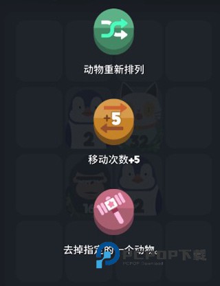 在这里道具主要分为三种:重新排列、移动次数+5和去掉制定的动物。