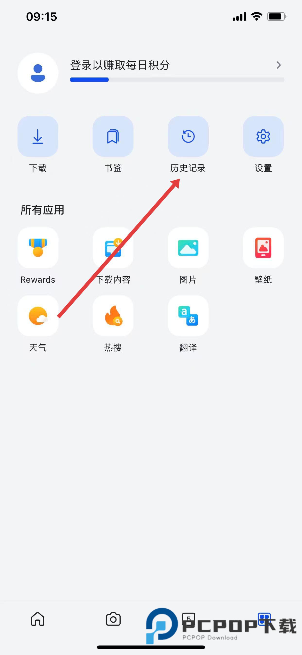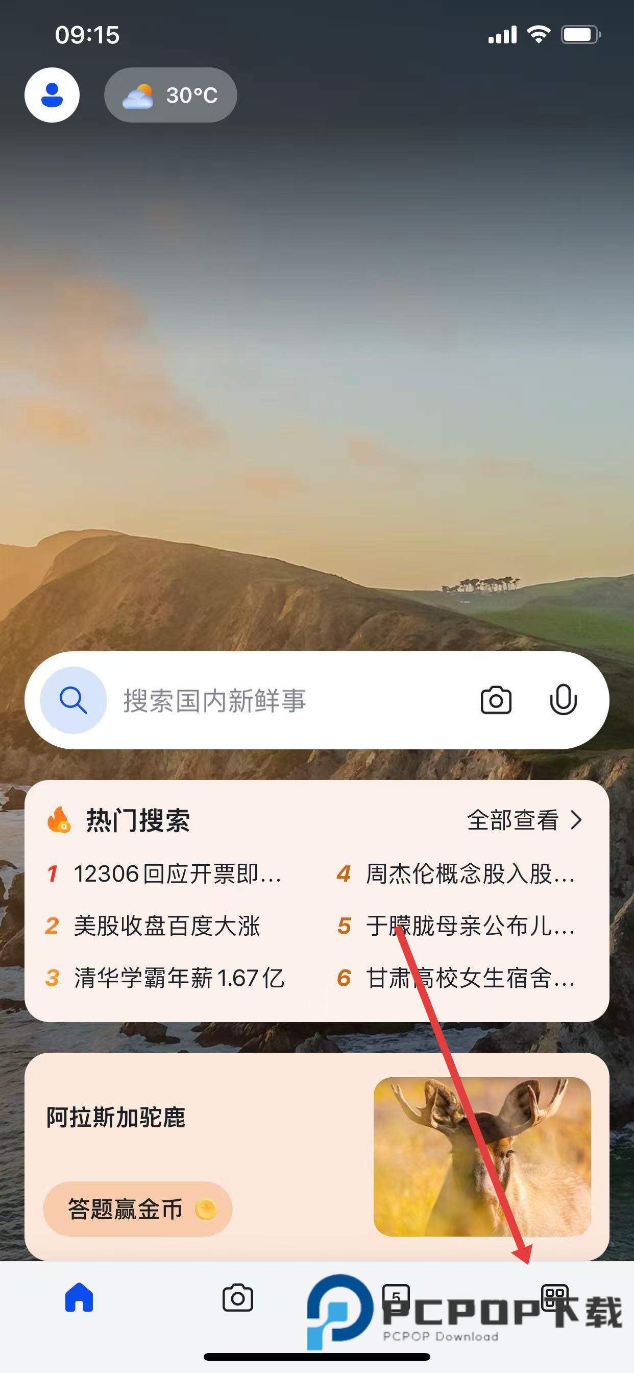 1、打开微软必应应用,点击底部导航栏中类似九宫格的应用图标。