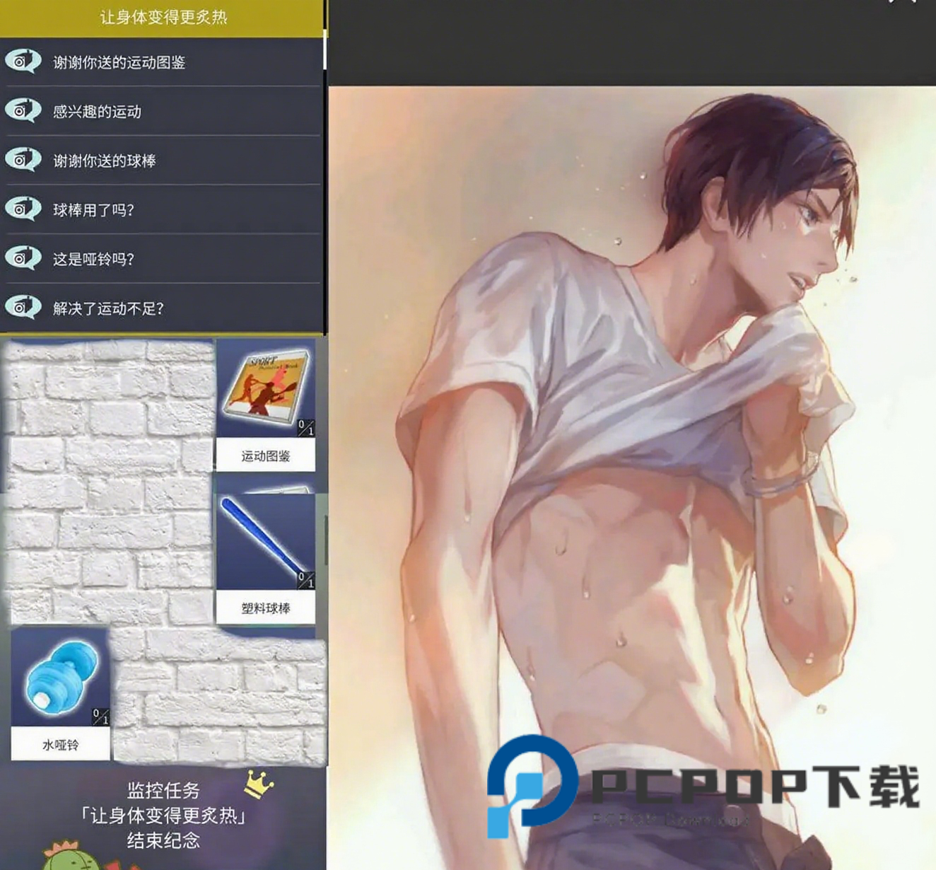 杂货店处购入「运动图鉴」「塑料球棒」「水哑铃」。