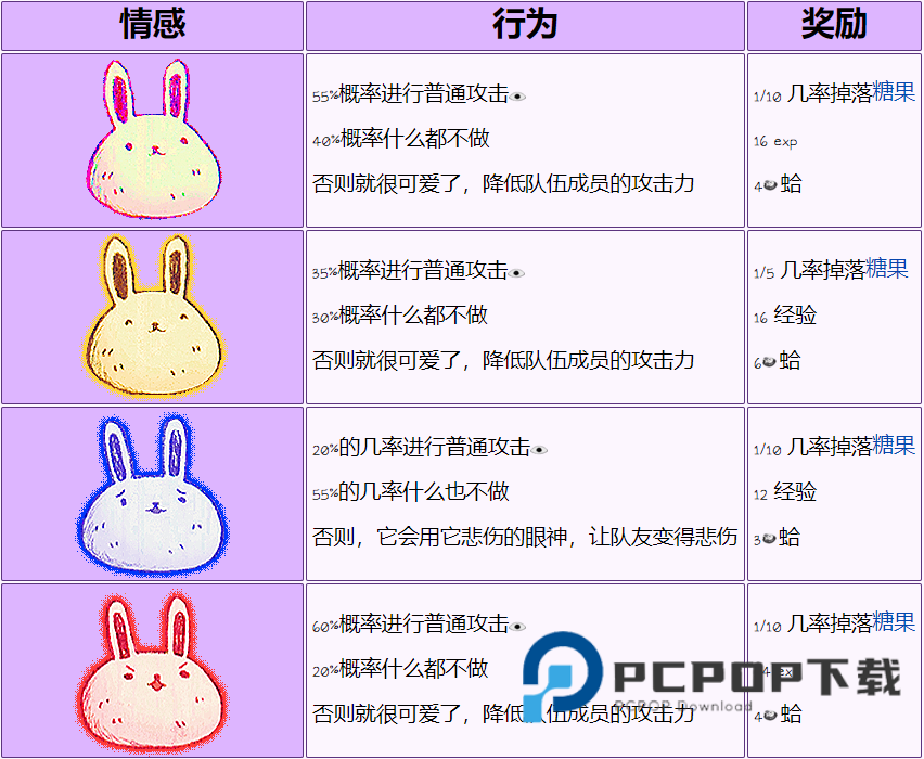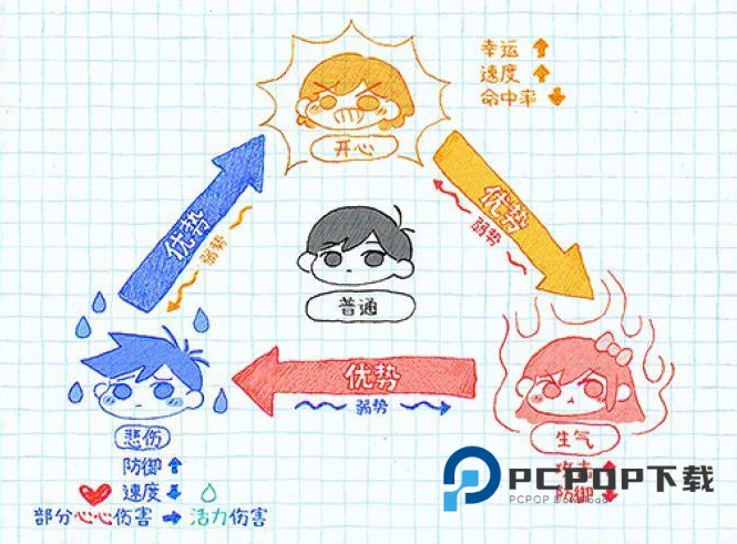 不同情绪有不同的效果,例如生气提高攻击,降低防御;开心提高速度和幸运,降低命中;悲伤提高防御,降低攻击,此外这些情绪还能进一步分别进化为愤怒、狂喜、抑郁。