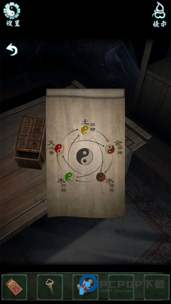 4、点击桌子上的纸条得到提示,按要求放置五脏的位置。之后点击书本得到符箓汇泉符和重要提示。