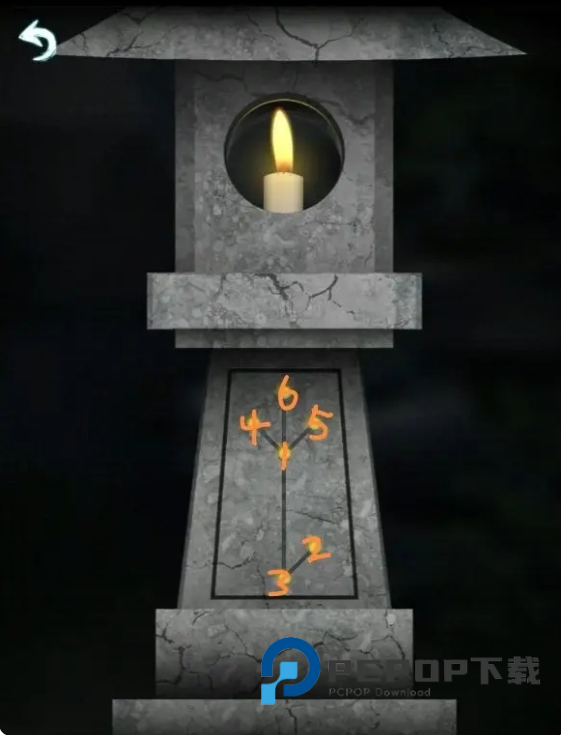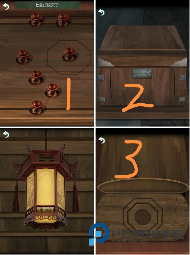 11、回到院子中点燃其中的石灯,根据石灯亮起的顺序点击正屋之中箱子的密码锁获得灯笼。