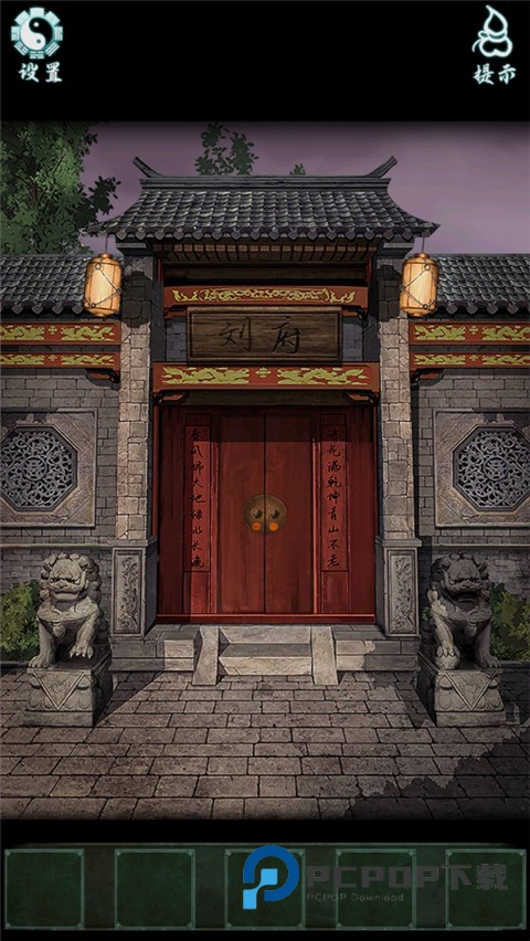 9、来到门口,将青花瓷球放入左边的石狮子爪子下得到钥匙,打开烧毁的画后面的柜子得到正屋的钥匙跟一幅画。