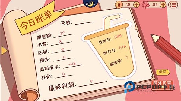 6、结算:接待完一定客人之后,就会自动形成账单,你可以选择跳过或者是看广告获得额外的贝壳。
