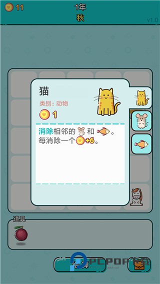 6、猫,可以消除相邻的老鼠和鱼,每次消除都能获得六个金币。