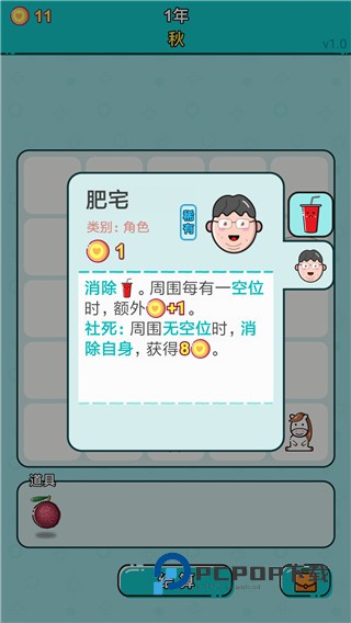2、肥宅,周围没有空位的时候,可以消除自身,获得八个金币。