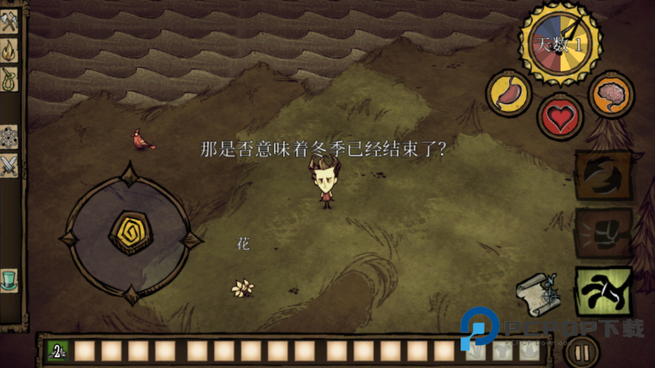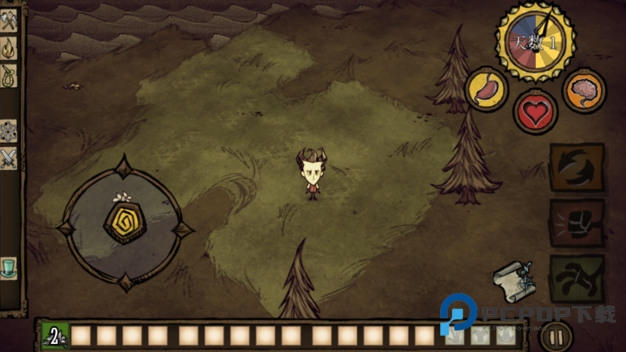 2、收集到的素材会被收在下方的背包列表中,玩家可以点击进行查看或者是行动。而左边则是提供给玩家将收集到的素材进行合成等,像是玩家可以收集「干草」与「树枝」来制作火把或营火,确保自己在夜晚的安全。除此之外,玩家还可以合成凿子、铲子、陷阱等等工具帮助自己收集更多素材。