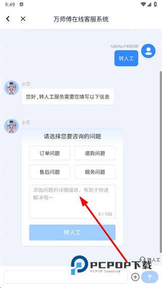 4、选择要咨询的问题类型并添加问题详细描述,点击转人工即可联系人工客服。