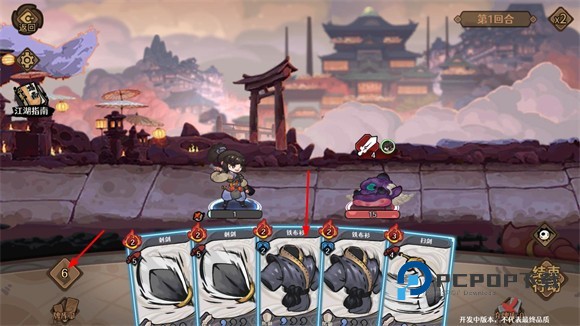 4、中间区域为可用手牌,左侧数字显示当前行动点(蓝框标识可用卡牌),行动点耗尽需结束回合。