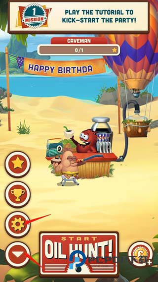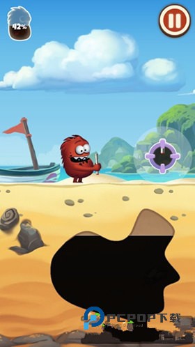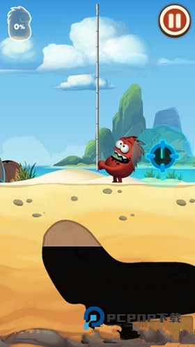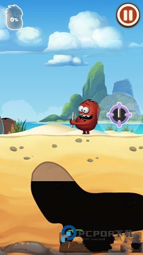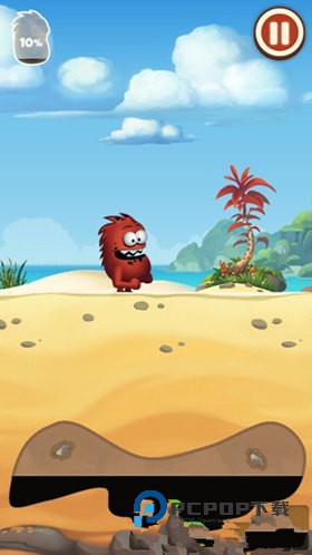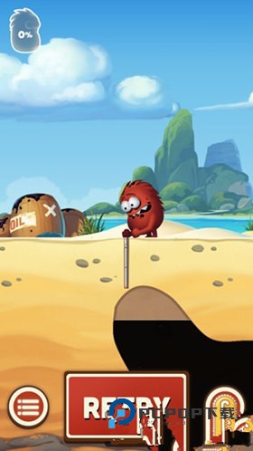1、小怪物出来的时候,手里会拿着一个可以伸缩的导管,有些像孙悟空的如意金箍棒一样,我们来到有石油的上方,按住屏幕中出现的按钮,就可以让导管边长。