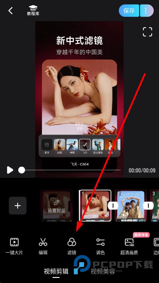 2、在剪辑页底部,点击滤镜功能,浏览新中式滤镜等样式,选择喜欢的滤镜效果应用到视频片段。