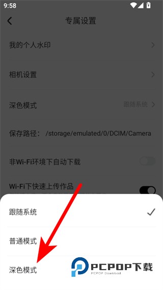 4、在专属设置页面,点击深色模式选项,弹出模式选择菜单。
