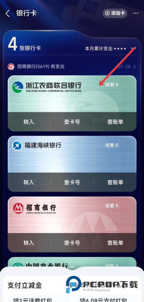 2、在个人中心列表中,找到并点击银行卡选项,进入已绑定银行卡的管理页面,查看所有绑定的银行卡信息。