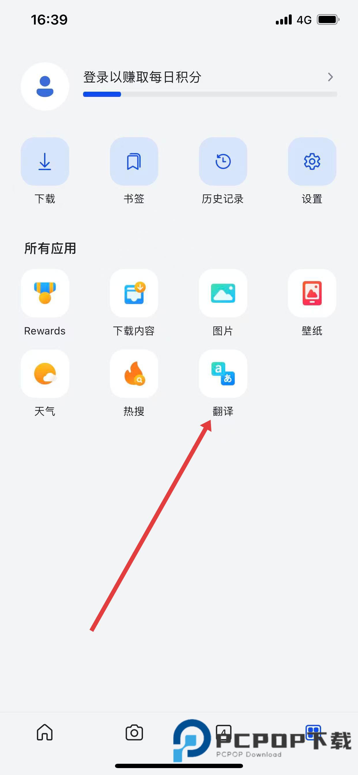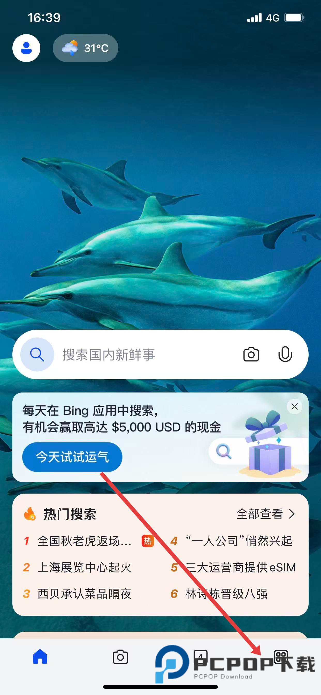 1、打开微软必应应用,点击底部导航栏右侧类似九宫格的应用图标。