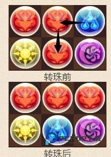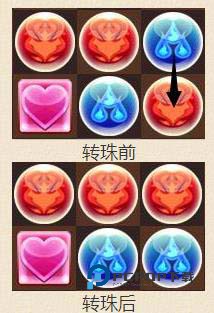 5、当同色的三颗珠形成图示所成的样子时,选择中间那颗水珠,按照图示箭头方向进行旋转,就可以让三颗火珠形成消除的排列啦~