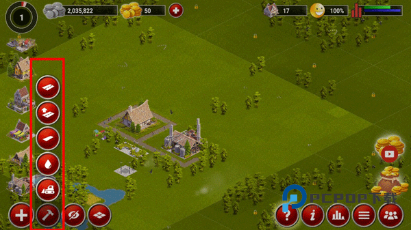4、去除建筑:点击左侧锤子按键,再选择铲车按钮,点击屏幕选择拆毁的位置即可;