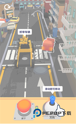 4、在游戏的过程中玩家将操作不同的车辆,每种车辆都有不同的操作方式,比如吊车需要滑动右侧摇杆控制吊杆移动方向,左侧则是松开夹子。