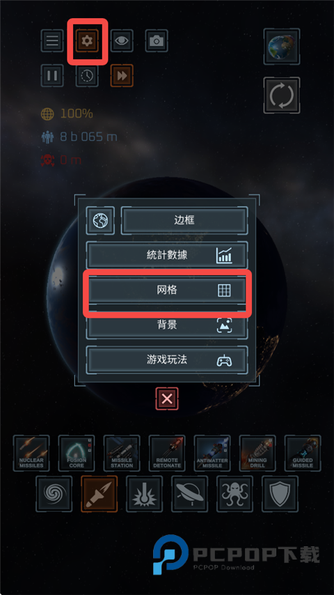 1、打开星球毁灭模拟器游戏,设置一个地球,点击左上角设置图标,打开网格。