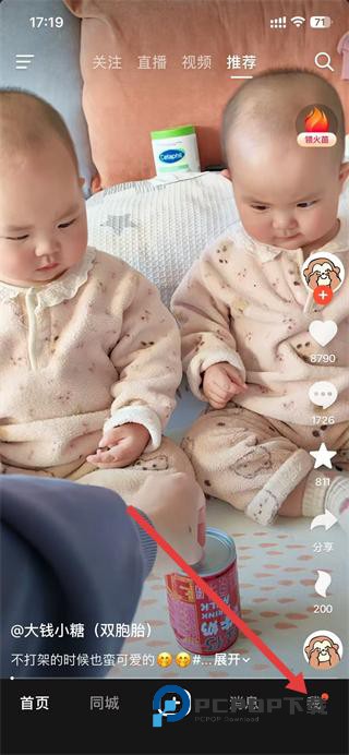 1、打开火山小视频,进入时点击下方消息的功能按钮。