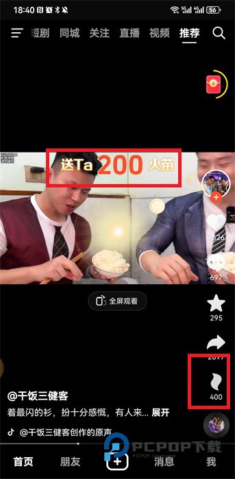 2、在视频作品界面,用户需要点击右下角的【火苗】标志,就可以给作品还有作者赠送火苗,连续点击就可以连续的赠送火苗;
