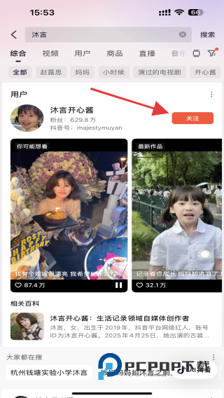 3、在目标账号右侧,点击关注按钮,按钮变为已关注即表示关注成功。