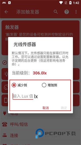5、在光线传感器窗口中,选择减少到或增加到,并输入目标Lux值,点击确定完成触发器的添加。