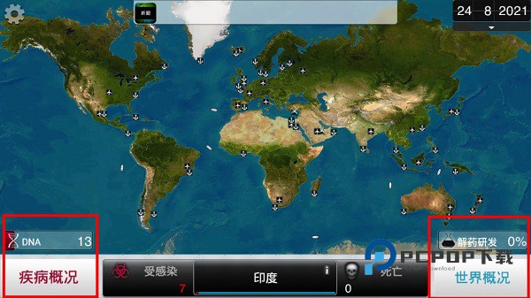 6、积攒了足够的DNA点数后,在左下方可以点开病情概况,对病毒进行升级变异,也可以在右下角查看解药研发情况