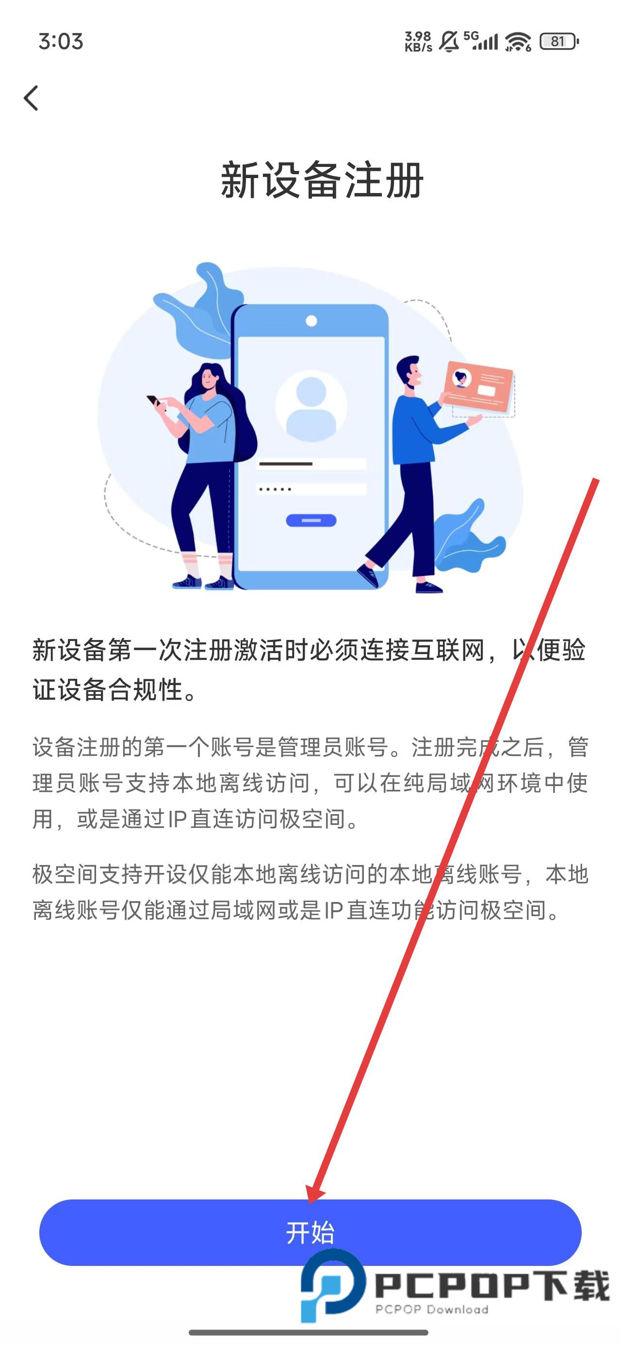 2、了解新设备注册说明后,通过点击下方开始按钮,开始注册操作。