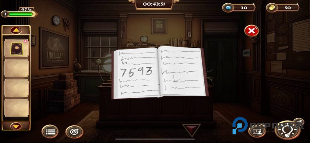 点击面板内的书籍即可旋转面板,露出隐藏在后面的书籍。收集隐藏的书籍并打开,即可看到秘密代码“7593”。