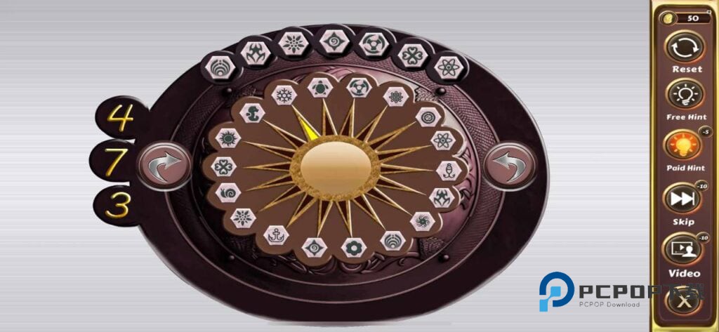 要完成这个谜题,玩家需要使用左右箭头将谜题顶部的七个符号匹配起来。左箭头顺时针移动,右箭头逆时针移动。3、7 或 4 表示在所选方向上跳过的格数。
