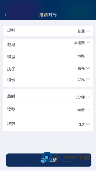 4、然后再设置对弈规则、对局模式、棋盘路、执子规则、棋份、局时、秒读和次数,最后点击邀请就可以啦!【注:要保证朋友是在线的,不然就无法邀请对局】