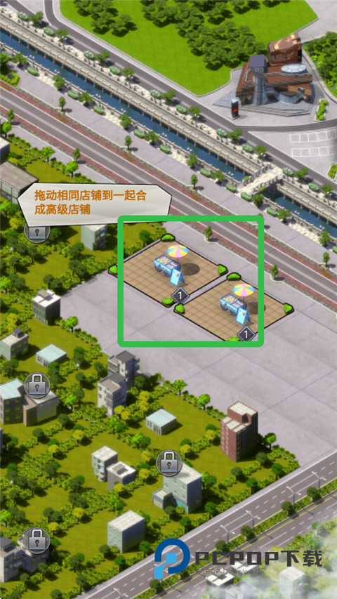 3、拖动两个相同店铺到一起合成高级店铺。
