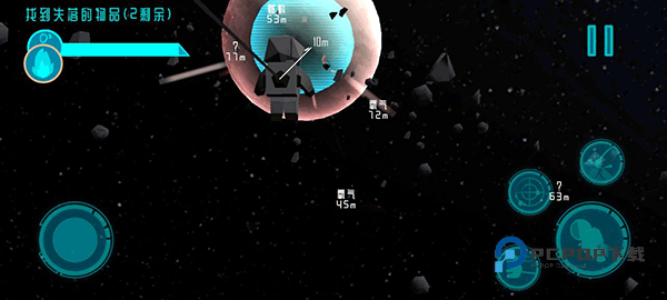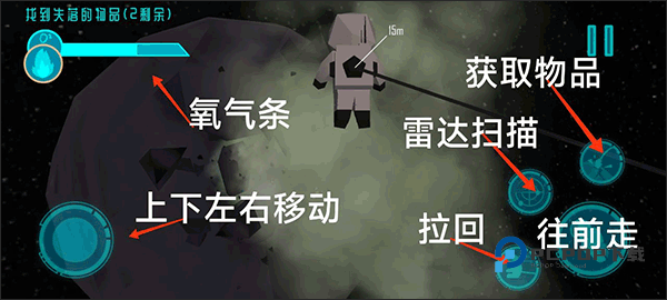 底下就是我们控制小人上下左右移动的方向键,但是小伙伴们要注意,往前推摇杆不是往前走而是网上看哦;然后我们看右边这4个键分别是拉回、雷达、获取物品和往前走,拉回获取物品和往前走小编就不多过多阐述了,雷达扫描可以帮助我们更好找到物品或者延长氧气的道具。
