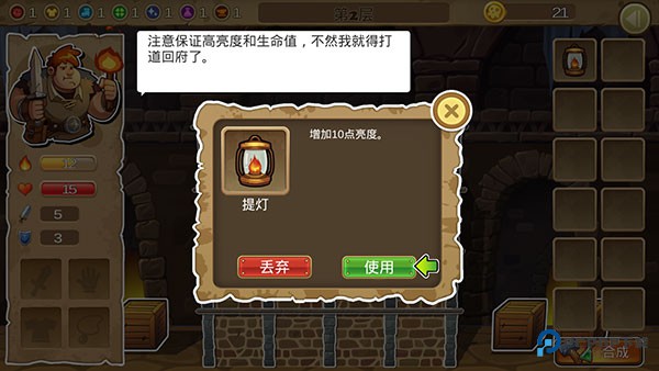 4、在游戏过程中,玩家可能会出现血量耗尽或火把熄灭的情况,这两种状态都十分危险。一旦出现这种情况,玩家可以用现有的装备进行合成补给;当然,如果不进行合成,也可以直接退出地下层,不过此时当前冒险的地下层进度将不会保存。