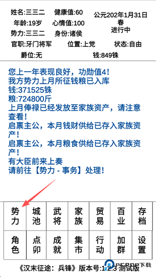 6、随后就是势力的发展,玩家可以点击屏幕左下方的“势力”。