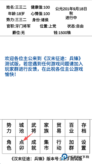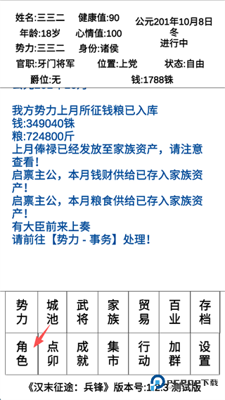 3、文字模拟的沉浸感,采用2D简约画风与文字叙述相结合的呈现方式,通过随机事件触发、对话选择等形式推进剧情,让玩家沉浸式感受汉末乱世的权谋与纷争。