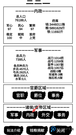 7、可以查看势力的详细信息,并且由于玩家是诸侯,所以可以决定势力的军事,内政,外交等事宜,随后点击“内政”。