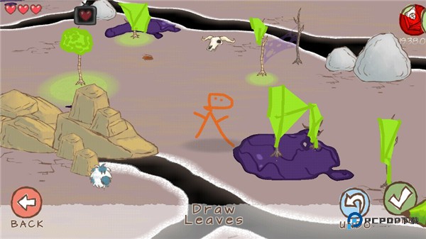 向右边前进,能够避开蓝紫色的岩浆区域。玩家可到达下方指定位置,然后使用屏幕下方的树叶画笔,在三根干枯的树枝上分别绘制树叶,即可顺利通过岩浆区域。继续前进后,你会遇到一只体型较大的老鼠,玩家只要一靠近它就会遭到攻击。因此,在靠近老鼠怪的树干上绘制树叶,就能将这只怪物消灭。玩家继续前进会触发剧情,随后需要前往救援被困的角色。同样,在靠近老鼠的树干上绘制树叶,就能对老鼠发起攻击,顺利推进救援。