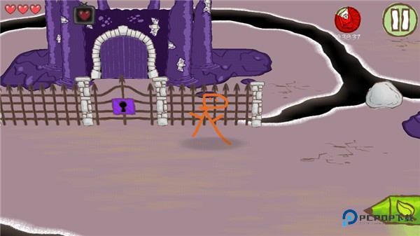 玩家进入游戏后,会发现自己身处一个由符文、石头和小花组成的阵法之中,这个阵法是玩家的复活地点,通常游戏推进到一定进度后,都会出现类似的重生点。在蓝紫色熔浆所在的区域,会对火柴人造成各类伤害,小伙伴们切记不要靠近该区域。屏幕下方的树叶画笔就是你的专属武器,在干枯的树枝上绘制一片树叶,不仅能获得重生机会,还能消灭即将出现的各类怪物哦!朝着右边方向前进,你会发现一扇被锁住的门。玩家需要找到一把钥匙才能打开这扇门,届时会有系统提示引导你找到钥匙。