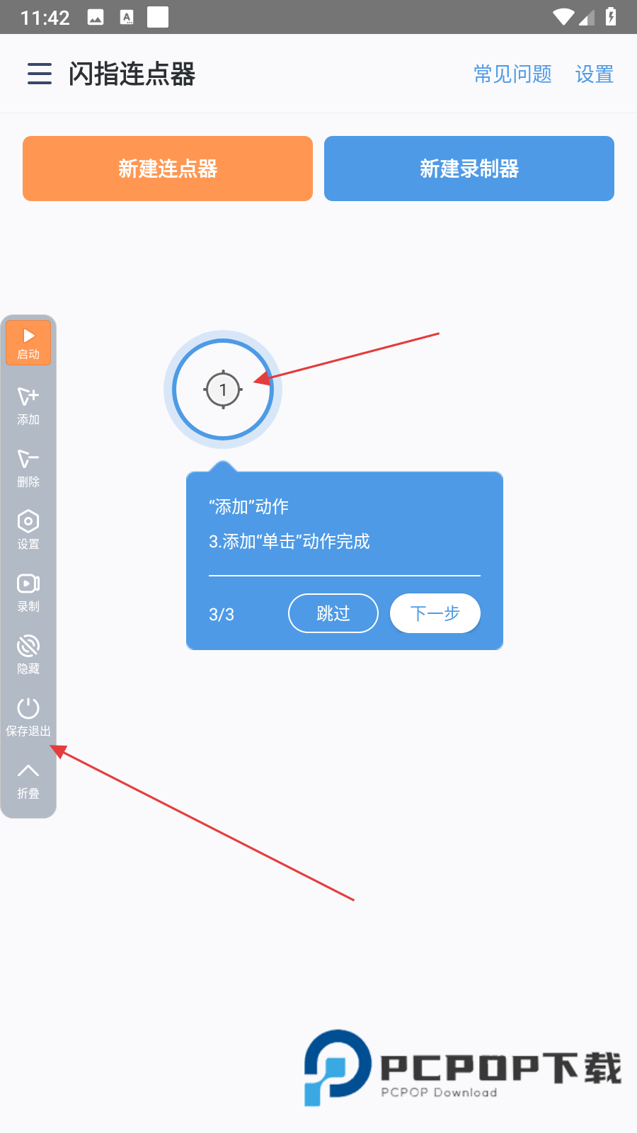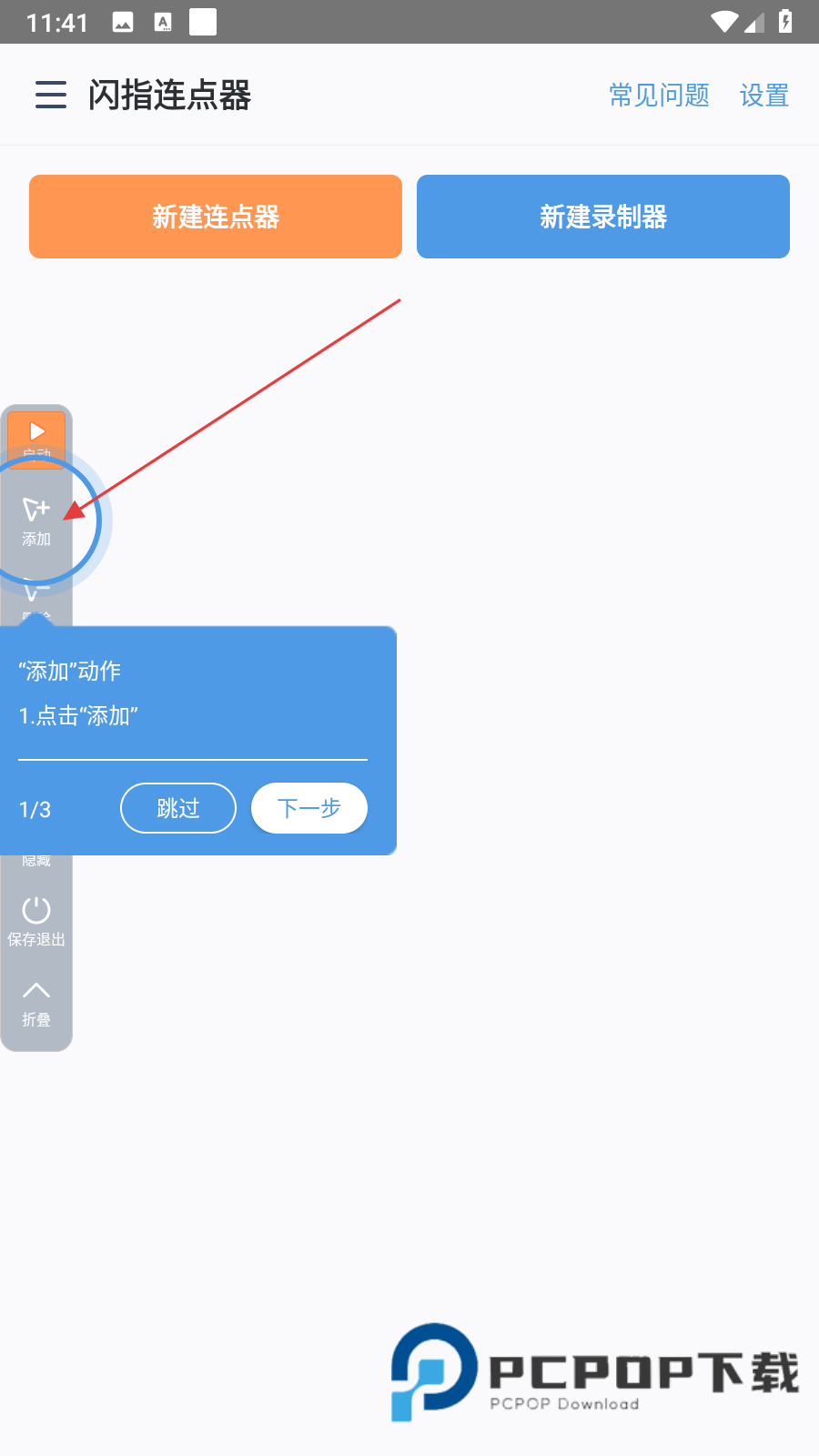 1、打开闪指连点器应用进入主界面,点击左侧栏中的添加按钮,开始添加自动化点击动作。