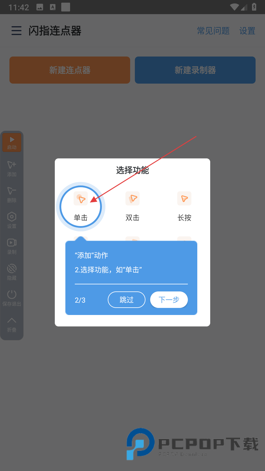 2、点击添加后弹出选择功能界面,选择需要的点击功能比如单击双击,长按,这里以单击为例,选中单击后点击下一步。