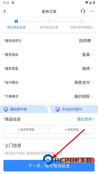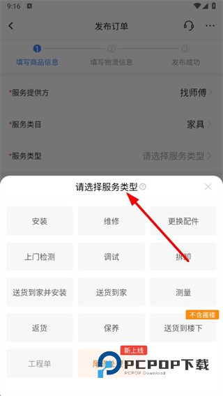 3、在发布订单页面选择服务类型和支付模式,填写商品信息和上门信息。