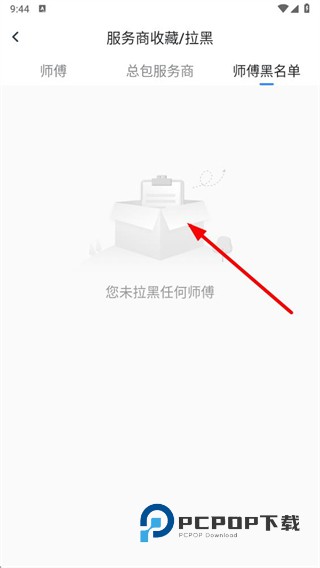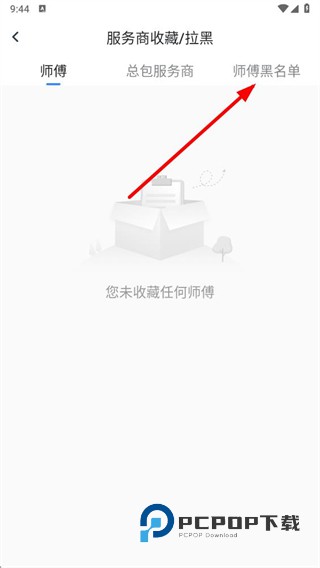 3、进入服务商收藏/拉黑页面后,点击师傅黑名单选项。