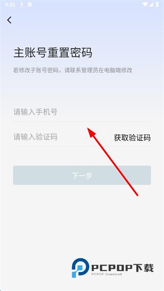 4、在主账号重置密码页面,输入手机号和验证码,点击下一步按钮,按提示完成密码重置操作。